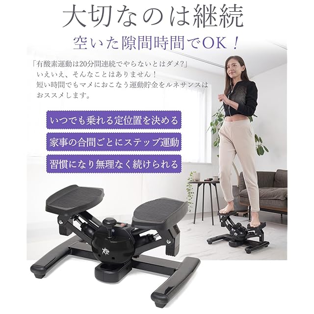 【ステッパー運動アドバイス】 腕ふりを大きく意識すると、上半身も連動して使うことができ運動量UP。 また、ウエストの捻り動作も大きくなりシェイプUPに役立ちます。腕をふる時に、肘を引き、肩甲骨をしっかりと動かすようにするのがポイントです。そして使っている筋肉を意識することでよりその部位を集中的に鍛えることになります。