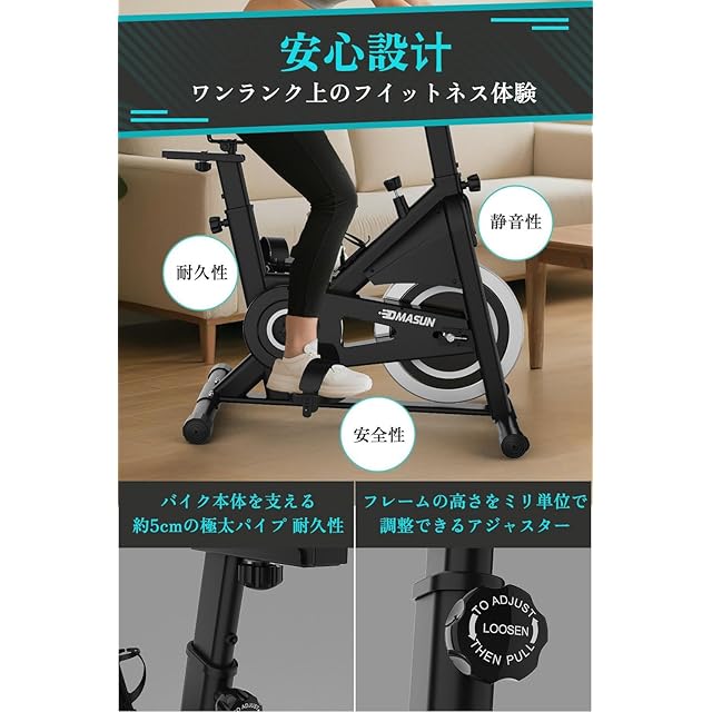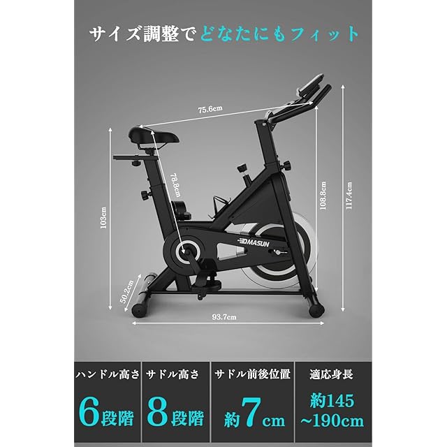【DMASUNが選ばれる理由】 DMASUNは、スポ一ツ製品の設計から製造、販売、アフタ一ザ-ビスまで-貫して提供するプロフエッシヨナルなスポ-ツプランドです。30年以上の経験を持ち、アメリ力、力ナダ、日本、イギリス、ドイツをはじめとする世界中に製品を展開。200万世帯以上にこ信頼のフイツトネス製品をお届けしています。また、DMASUNのスピンバイクには5年間の無償修理·交換対応があり、万が一のトラプルにも安心です。