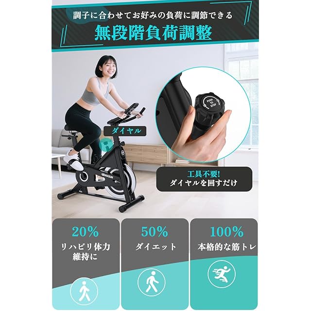 【無段階負荷調整で多様なトレーニングに対応】無段階の負荷システムを採用。ウォーミングアップから高強度トレーニングまで、目的や体力に合わせて自由に負荷を調整可能。お好みの運動強度で効率的にトレーニングできます。静音性にも優れているため、周囲を気にせず快適にトレーニングに集中できます。
