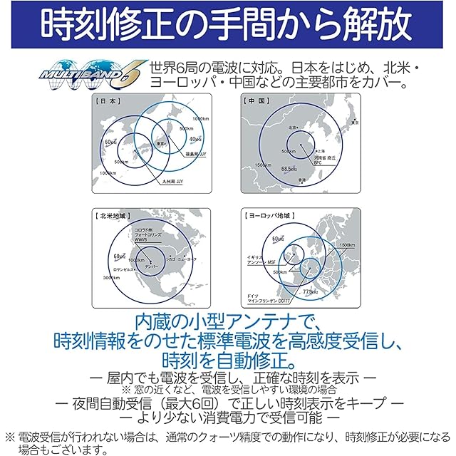 カレンダー機能有 ※フルオートカレンダー●電波受信機能有 ※世界6局(日本2局、中国、アメリカ、イギリス、ドイツ)の標準電波を受信し、時刻を自動修正するマルチバンド6