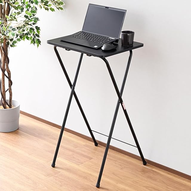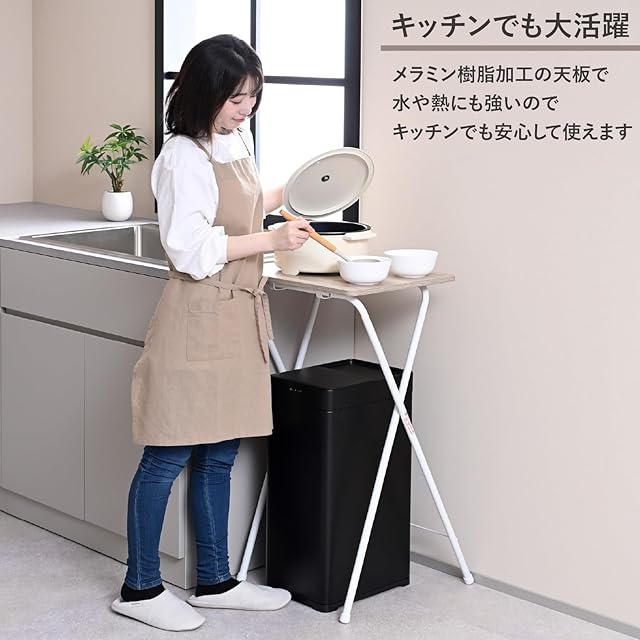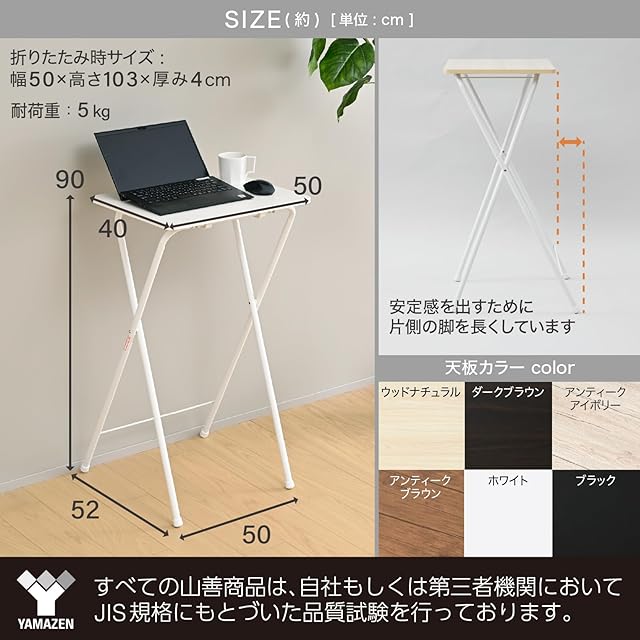 ●本体サイズ(約) : 幅50×奥行52×高さ90cm●折りたたみ時サイズ : 幅50×奥行103×高さ4cm●天板サイズ : 幅50×奥行40cm●全体耐荷重 : 5kg●材質 : フレーム/スチール(エポキシ樹脂塗装)、天板/合成樹脂化粧パーティクルボード(メラミン樹脂加工)