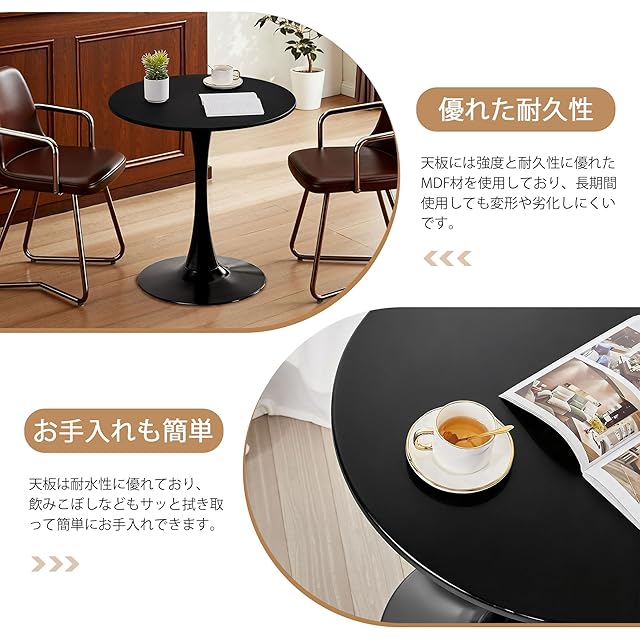 【多用途で活躍するテーブル】このテーブルは、ダイニングテーブルやカフェテーブルとしてだけでなく、オフィスの作業スペースや会議用テーブル、リビングのサイドテーブルなど、さまざまなシーンで活躍します。丸型デザインは、角がないため小さなお子さんがいる家庭でも安心して使用でき、空間に優れた柔らかさと温かみを加えます。シンプルでありながら多機能なテーブルとして、どんな場所でも活用できます。