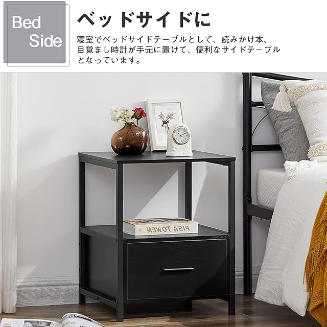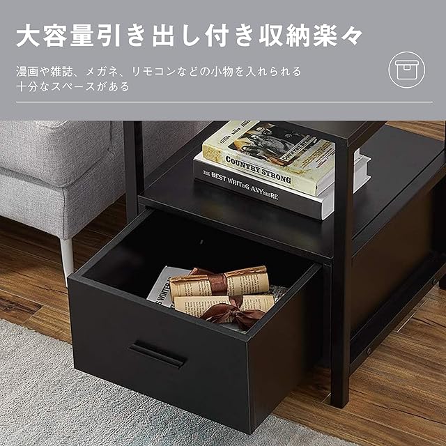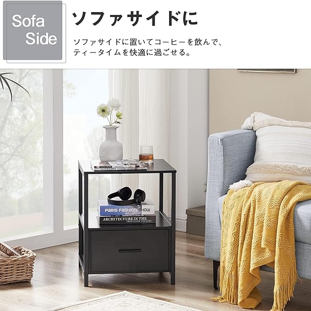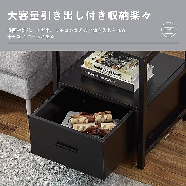 【たっぷり収納】大容量引き出し付きで、漫画や雑誌、メガネ、リモコン、タブレットなどの小物を入れられる十分なスペースがあります。2段オープン棚は、コーヒーカップをおいて、スタンドライトを置いて読書にも最適です。
