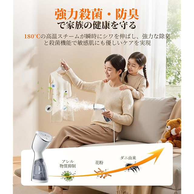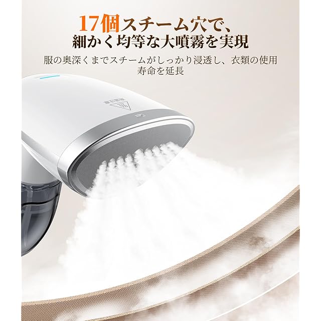 【17個の均一噴射口で広範囲をカバー!強力ミスト量!】17個のスチーム噴射口が細かく均一なスチームを大量に噴霧し、頑固なシワを効率的に伸ばし、衣類を優しくケアします。大量スチームで速やかにシワを取り、衣類を素早くきれいに仕上げます。