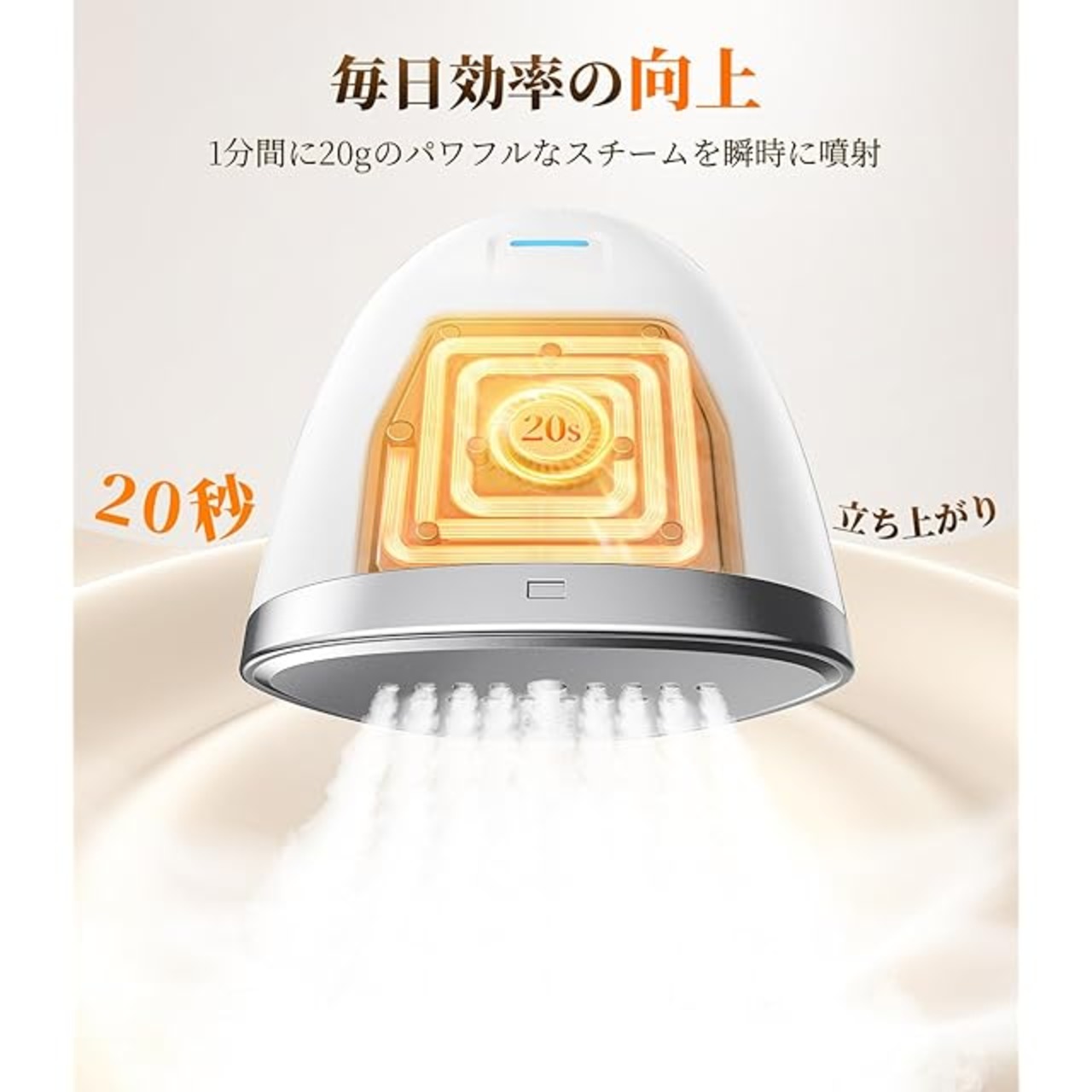 【20秒で瞬時加熱、待機時間ゼロ】 忙しい朝でも問題なし!わずか20秒で素早く加熱され、すぐに使用可能です。1000Wのハイパワーで、即加熱アイロンとして、短時間で効率的にシワ取りを行えます。忙しい朝の準備や急な外出前にもサッとお手入れが可能です。