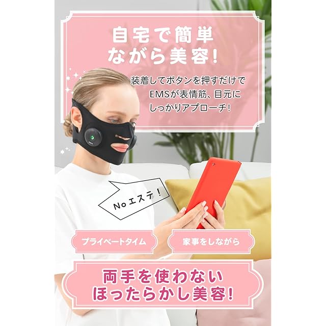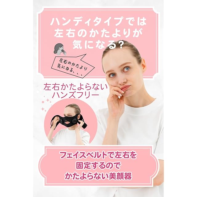 【かたよらない美容】片手を使用する美顔器だと同じ時間同じ個所を左右対称に使用するのは難しいですが、フェイスベルトで固定しながらEMSを使用するのでかたよらない美容ができます! フェイスベルトの生地に肌が合わない場合はすぐに使用をやめてくださいませ。