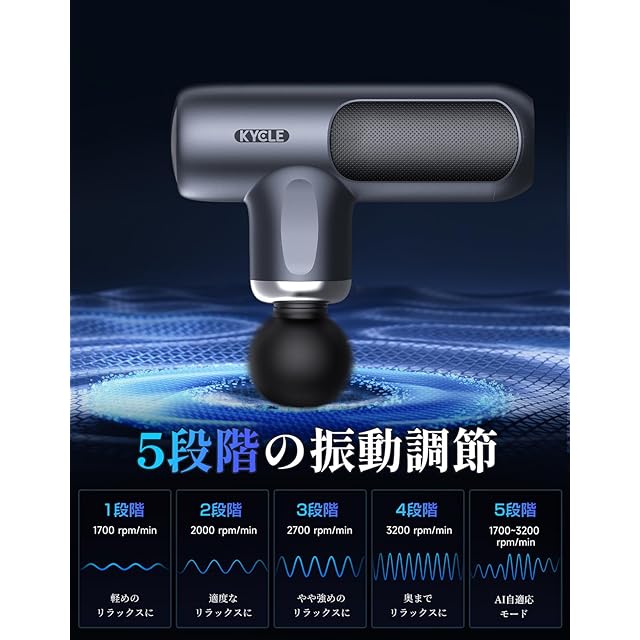 【5段階強力振動&AI自動モード】Kycle筋膜リリースガンは先端ブラシレスモーターを搭載して振動を8mmにある深層筋肉までにアプローチさせます。 1700~3200回/分の振動強度調整機能も搭載しており、お好みやストレスに組み合わせることができます。 1~4レベルは手動モードで、5レベルはAI自適応モードとなっており、筋肉に押し当てる強さに応じて振動の頻度を自動で調整します。すべての操作はハンドル底面に位置するワンボタンで簡単に制御できます。