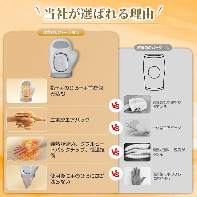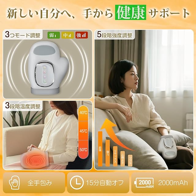 【❓❓❓指が包まれない?サイズが小さすぎる?最弱の圧力が強すぎる?使った後に跡が残る?操作が面倒?そんな悩みにさよなら!!!】2025最新デザイン完全包み込み型ハンドモミが新登場! ✨本品はフルカバー設計で20層のエアバッグを備えており、従来のハンドケアとは異なり、使用後に手に目立つ跡が残ることはありません。また、市販の3段階強度調節に比べて、5段階強度調節を持っており、初心者から本格的なリラックスを求める方まで幅広く対応。✨入口は大きく、女性の手はもちろん、男性の大きいサイズの手にもしっかりフィットし心地よくケアします。そして温熱機能を組み合わせて、冬はハンドウォーマーとしても使用可能。✨更に、専用の収納袋付きで、使わないときも、ホコリが溜まらないようにしっかり収納できます。✅しかも使いやすく、初心者でもすぐに手に入る。祝日や誕生日にご両親や親しい友人に贈る絶好のプレゼントでもある。