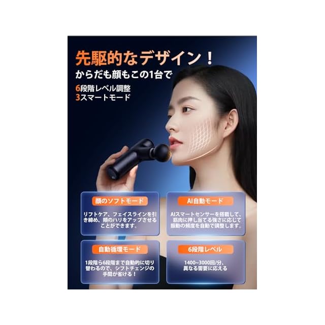 【一歩先行く! からだも顔もこの1台で】価格も、性能も、デザインも妥協しない。理想のハンディガン、新登場!Lihilisの最新のアップグレードされたリリースガンは、身体のさまざまな部位だけでなく、顔にも使える、首や顔のケアが可能です。身体のケアと 顔ケアが一体化し、1台のリリースガンに美容器具、首リラクゼーション器、肩リラクゼーション器、腰リラクゼーション器、脚リラクゼーション器などの機能が組み込まれています。1台ですべてのケアが可能です。今から美容と身体のケアの新しい時代を始めましょう!美しさも叶えるハンディガン。軽く当てるだけ。これ1台で、すっきりフェイスに導くリフトケア※も。お顔も首も、すっきり美印象へ。