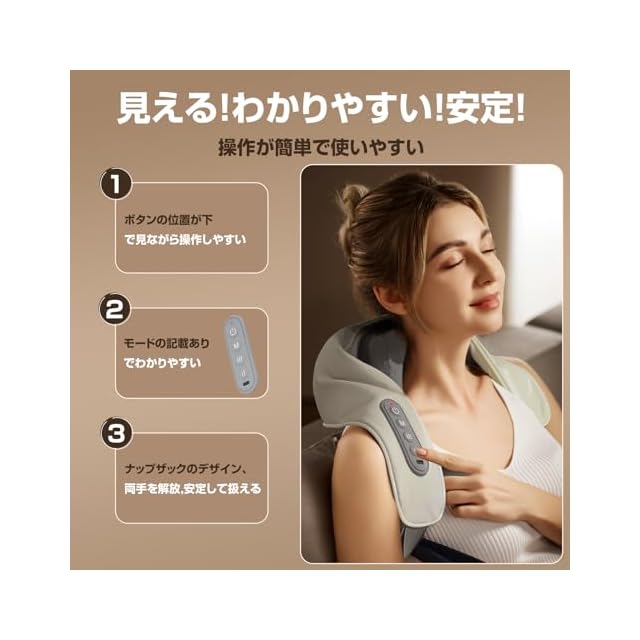 【コードレス設計、両手を解放】USB-C充電式設計で、使用時に電源に接続する必要はありません。仕事中に椅子に座りながら、リビングでテレビを見ながら、ソファに横になりながら……など、ながら使いしたい人は、やはりコードレスで使えるネックリラクゼーション器が便利。バックルストラップのデザイン、手で引っ張る必要がなく、手を解放します。仕事をしながら肩や首のケアができます。