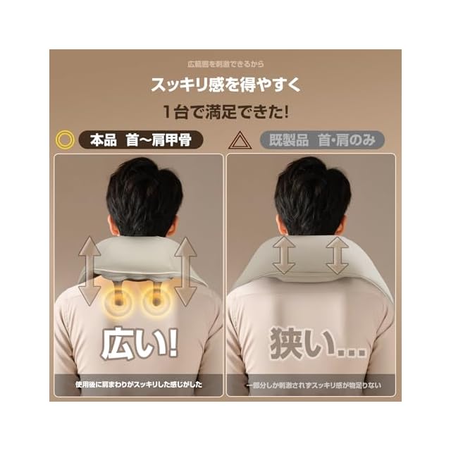 【広範囲を刺激】既製品に比べてもっと強く、気持ちいい“ケアアーム”を搭載。従来品は肩のみのケアでしたが、このリラクゼーション器のケア範囲は肩甲骨まで広がります。スッキリ感を得やすく!