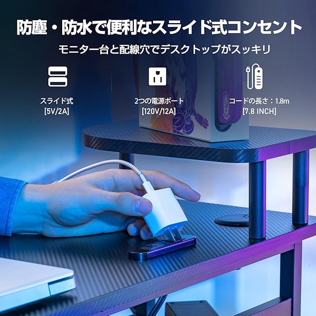 【物の落下を防ぐための仕切り板】市場に多くのL字デスクとは異なり、この製品には物の落下を防ぐ仕切り板が付いており、特に壊れやすい物を守ります。思わぬ落下から守られ、デスクを使うときの気分がより快適。【小型モニター台と配線穴&コンセント付くpcデスク】小型モニタースタンドには、パソコンやiPadなどの小物を置くことができ、2つのコンセントが付いており充電が便利です。さらに、配線穴があり、配線もスッキリとまとめられます。