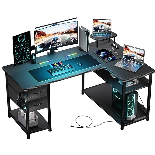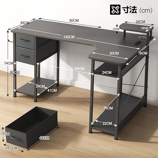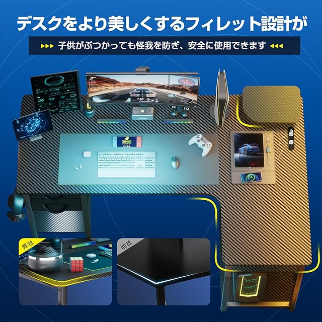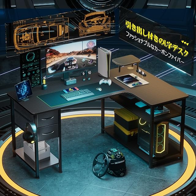 【高級感溢れるカーボン調&人気の理由】アップグレードされたL型ゲーミングデスクで、広々とした空間と抜群の収納力を手に入れよう!「ファッショナブルなデザイン」×「高級感あふれるカーボン調」×「2層引き出し付き」×「コンセント付き」×「可動式棚」×「小型モニター台」×「配線穴」×「物の落下防止の仕切り板」など、便利で機能的なデザインがさまざま。美しさと実用性を兼ね備えた究極の選択です。