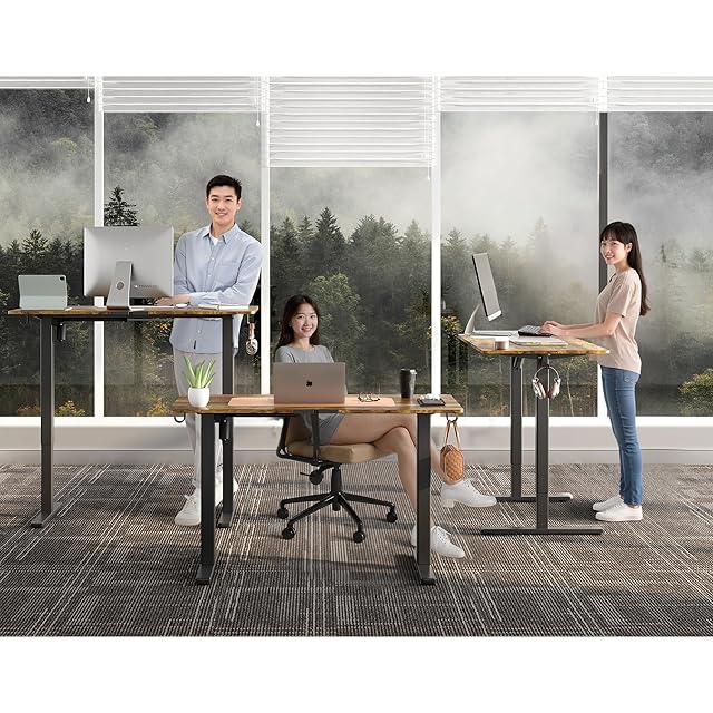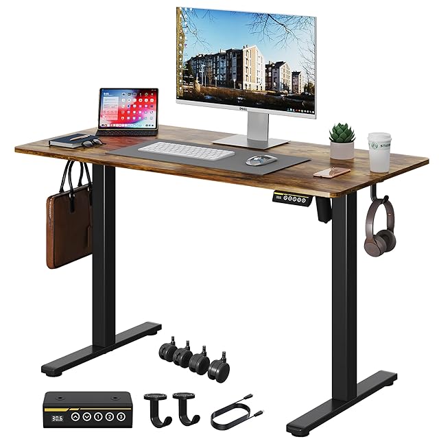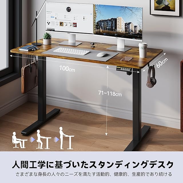 Gamork 電動スタンディングデスク 高さ調整70CM-118CM ゲーミングデスク メモリ機能/フック/ロック可能なキャスター サイレントモーター 勉強、ホームオフィス、リモートオフィス、一人暮らしに最適 (ラスティックブラウン, 幅 100 cm x 奥行き 60 cm)