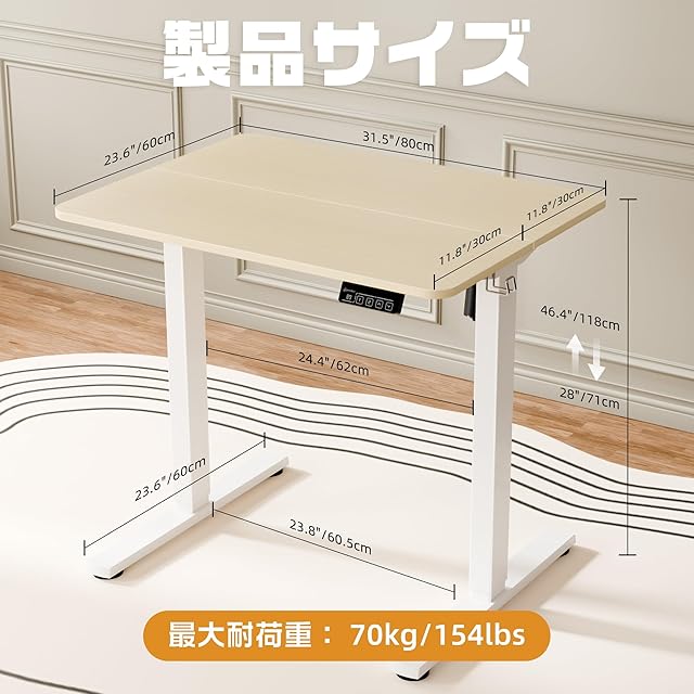 「商品仕様」 製品名:電動式昇降デスク 天板サイズ:幅さ80CM*奥行60CM 天板厚さ:1.5CM 本体重量:15.7KG 耐荷重70KG 本体材質:鋼鉄合金 高さ調節範囲:71-118CM