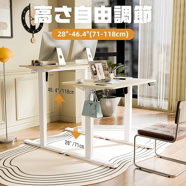 「安定性と耐久性」 このスタンディングデスクは、安定性と耐久性を確保するために、先進的な技術と高品質な素材を使用しています。家庭やオフィスで長時間使用しても、優れたパフォーマンスを維持します。