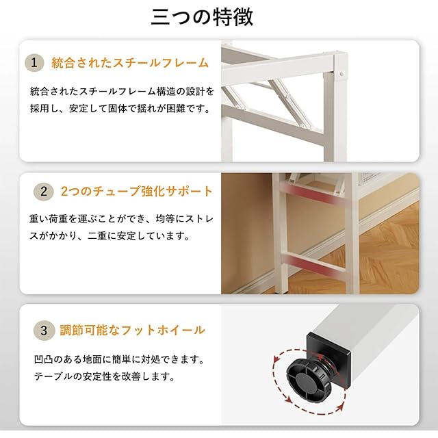 【天板材質】:高品質木板を採用します、耐荷重が優れます。改良技術により天板が均一に塗布されます、すり傷がしにくい、軽度防水ができます。切創・衝突防止ため、四角にR角に仕上げられています。