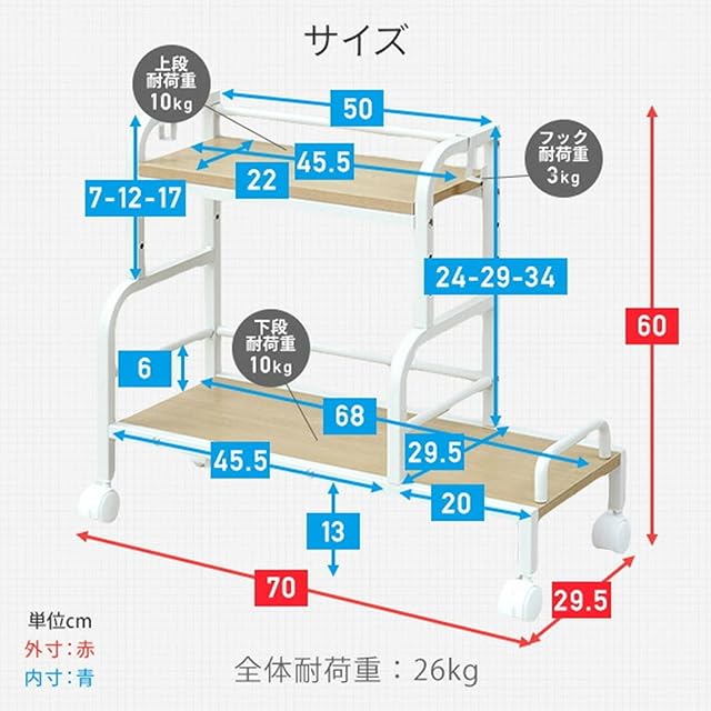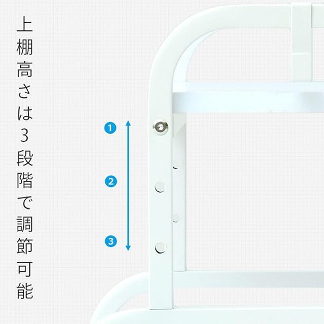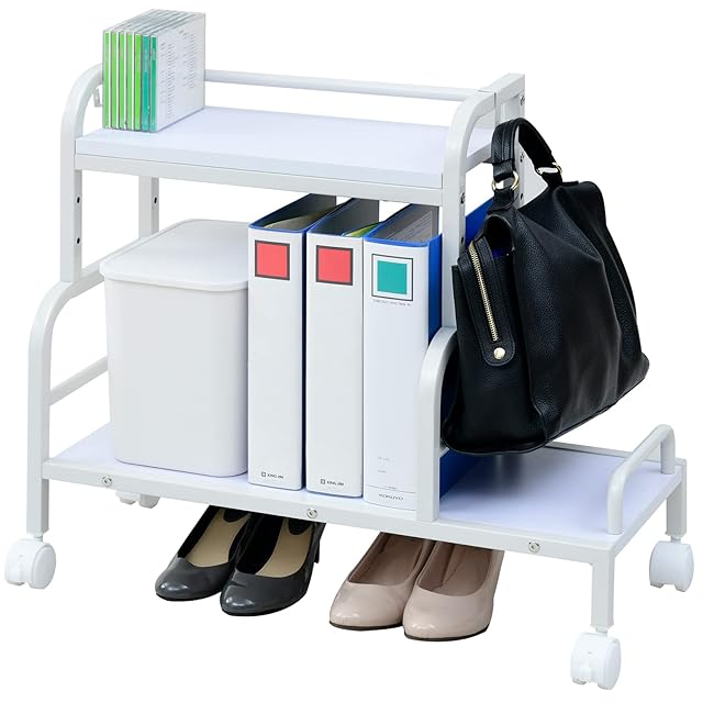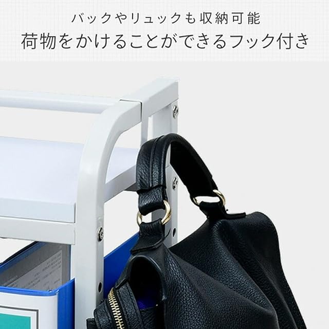 【バッグ置き・引っ掛け収納・小物置き】下棚(小)には大きめバッグも直置きできます。また、両サイドにはフックが付いているので、バッグや折りたたみ傘などの引っ掛け収納にオススメです。上棚は高さを3段階で調節可能できます(上棚を一番上で設置した時のみ下棚にA4ファイルを収納できます。)小物類の収納にオススメです。