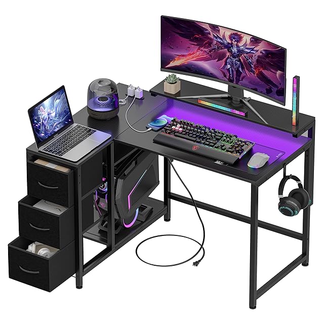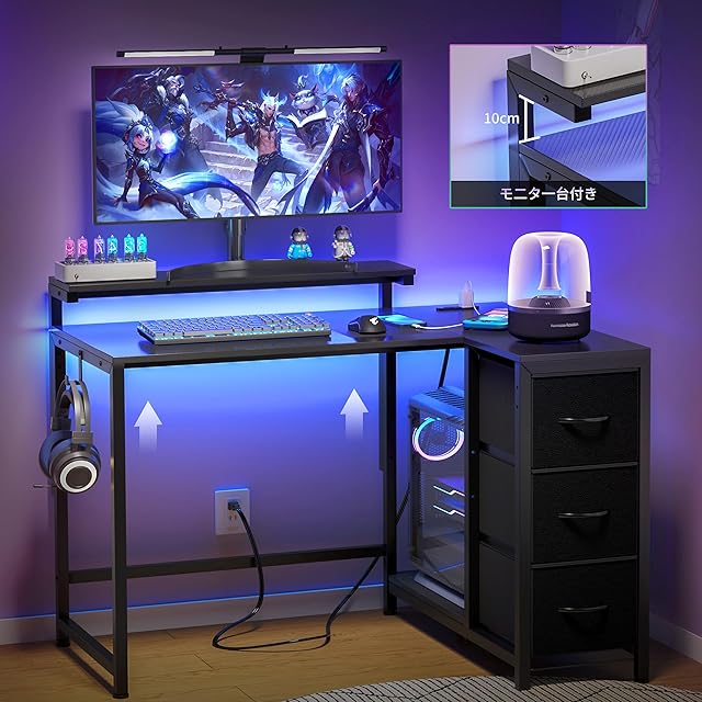 LunarLight PCパソコンデスク 幅108奥行80高さ85-108.5cm テレワーク L型デスク・左右組み換え自由 モニタ台の高さ調節可能 引き出しとコンセント付き 収納たっぷり ゲーミングデスク オフィスデスク 書斎 収納ラック付き(カーボンファイバーブラックCBK)