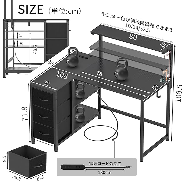 【多機能収納ラック】L型とモニタ台は両方左右に自由に調整できます。そして、モニタ台の高さを広く調整できて、A4本など収納できる。棚板も三段階可動できて、パソコンを収納しなくても好きな物で収納できて楽です。 パソコンや資料を置ける広さのL型天板で勉強やテレワークに最適。