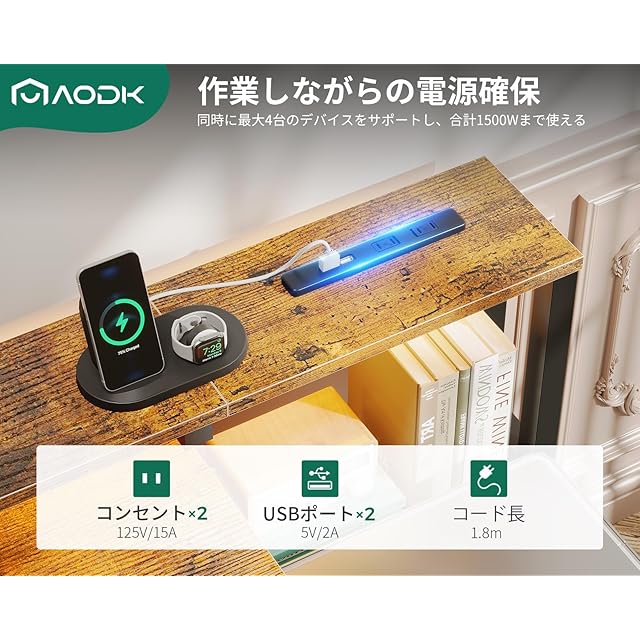 【コンセント付き、作業しながらの電源確保】机にはコンセント2口+USBポート2口が付いている。同時に最大4台のデバイスをサポートし、合計1500Wまで使える。手近なところで電源が取れ、スマホやタブレットなどの充電が便利になり、電池残量を気にせずに長時間の作業が可能。