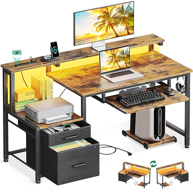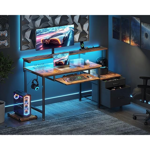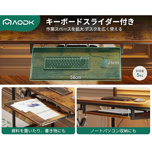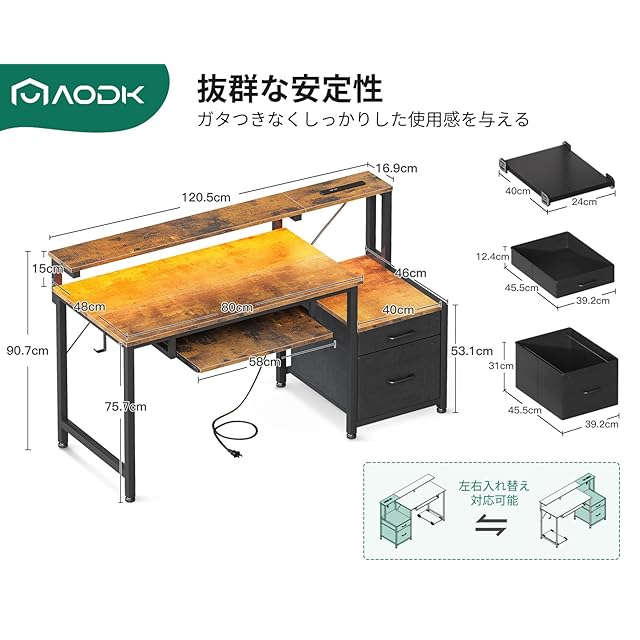 AODK パソコンデスク ゲーミングデスク 引き出し&キーボードスライダー付き 幅120cm 机 pcデスク computer desk 桌子 コンセント&LED付き ゲームデスク 長机 CPUスタンド付き 在宅ワーク 左右入れ替え対応 ビンテージ