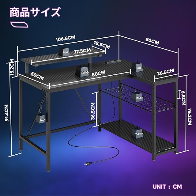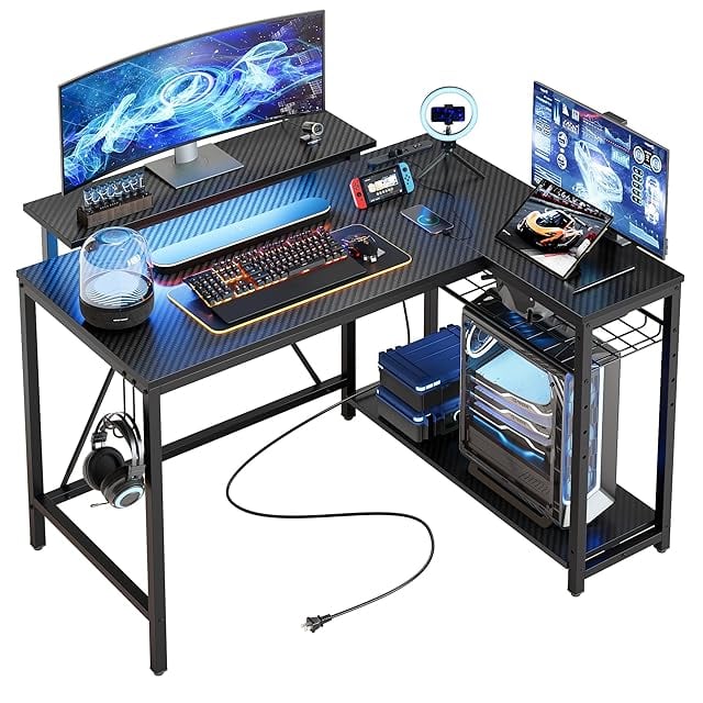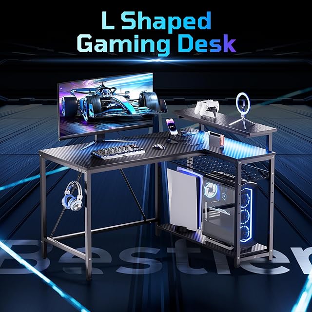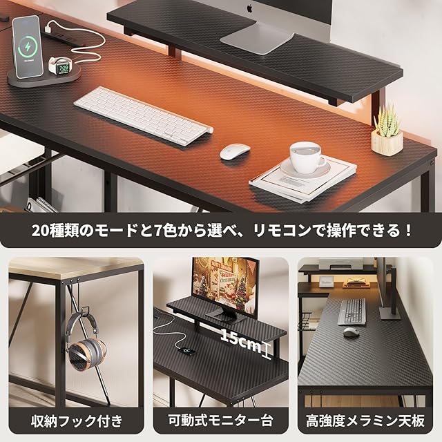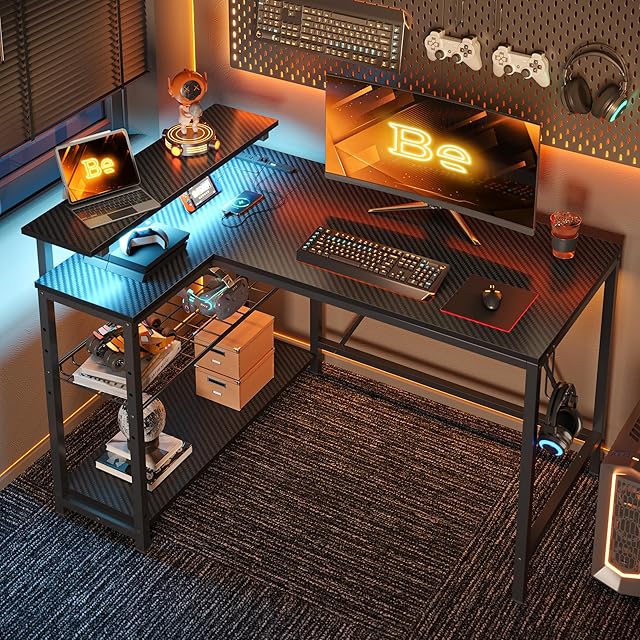 Bestier ゲーミングデスク L字 パソコンデスク 幅107cm コンセント&モニター台付き USB-C対応 机 pcデスク ラック付き 左右組み換え可能 棚高さ調節可能 ゲームデスク LEDライト付き カーボン調ブラック