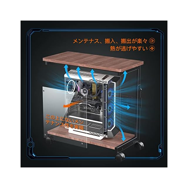【独創的なコの字構造!安定性や強度、デザイン性を飛躍的に向上させ、PCメンテナンスのしやすさも頂点に】既存PCラックの構造は、4本の支柱を上下の天板に直に取り付ける製品がほとんどでした。U-POWERのPCワゴンは、4本の支柱の代わりに、独創的なコの字構造のスチールフレームで天板を支えています。安定性と強度が高まり、既存製品の欠点をすべて改善しただけでなく、組み立ても簡単になりました。耐荷重量は、大幅アップしました。下の天板はフル活用でき、ほとんどのPC(幅30cmx高さ65cmまで)をスムーズに設置可能です。支柱が邪魔になってしまう既製品と違って、PCをラックから出さずにメンテナンスできます。デザインも抜群であり、一目ぼれしてしまうような見た目も魅力的です。
