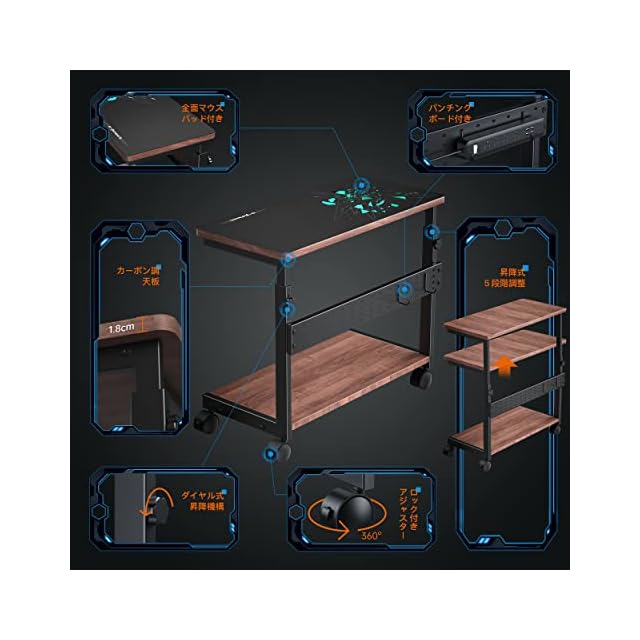 【既存品を改良して新機能を追求】 ダイヤル式高さ調整機構や、取付式パンチングボードなど、使いやすい機能を追求しました。カーボン調天板については厚みを従来比で2割増しにしています。全面を覆うマウスパッドは、高級感にあふれていて贅沢な雰囲気です。高品質キャスター(ロック付き)も搭載されているので、自由な場所に移動・固定して利用できるのも便利です。
