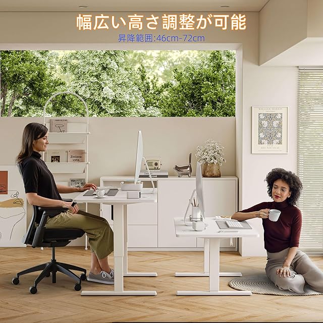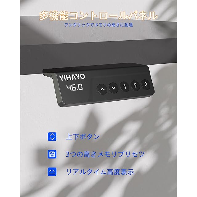 【高さ調節可能なオフィスデスク】YIHAYOの電動昇降デスク脚は、高さを46cmから72cmまで自由に調整することができます。子供であっても大人であっても、身長や姿勢に合わせて設定することが可能です。さらに、最大3つの高さを記憶する機能が付いており、ボタン一つで座位と立位を切り替えることができ、お好みの高さに合わせることができます