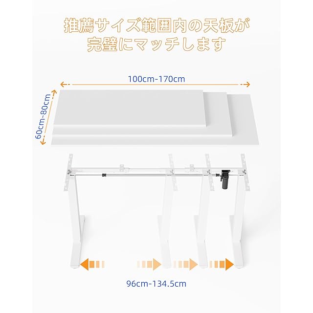 【拡張可能なフレーム】YIHAYOの電動昇降デスク脚は、拡張可能なデザインを採用しており、伸ばす範囲は96cmから134cmまで可能です。幅100cmから160cm、奥行き60cmから70cmのデスクトップに対応し、各自のニーズに合わせて自由に組み合わせることができます。同時に、このフレームには優れた耐荷重能力と垂直昇降駆動力があり、最大70KGの重量を安定して支持することができます