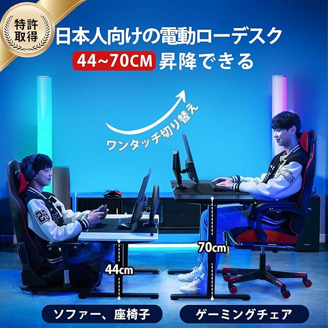 【特許取得の人気で革新的な昇降ローデスク】高さ46-72cm(2cm天板を含めて)昇降、日本人に合った電動昇降式ローデスクです。座椅子、レーシングシミュレーター、ソファ、デスクチェア、ベッドなど、さまざまな座席に対応しています。また、子供の成長に合わせて高さを調整できます。