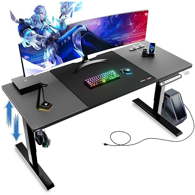 GTRacing ゲーミングデスク パソコンデスク ローデスク 電動 昇降式 静音 速い 安定昇降 デスクマット付き コンセント付き フック ケーブルマネージャー 耐荷重80kg 幅110cm×奥行55cm×高さ46~72cm(2cm天板を含めて) 人間工学 カーボン調 GTS111-110-CFBLK