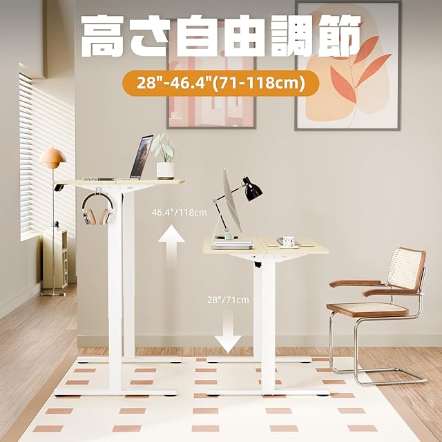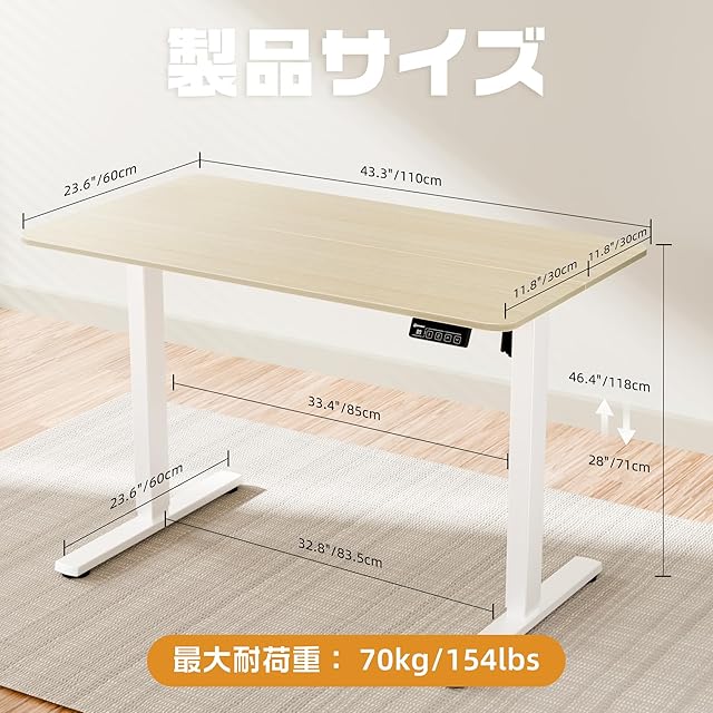 「商品仕様」製品名:昇降デスク 天板サイズ:長さ110CM*幅60CM 天板厚さ:1.5CM 本体重量:17.7KG 耐荷重70KG 本体材質:鋼鉄合金 高さ調節範囲:71-118CM