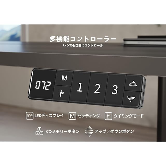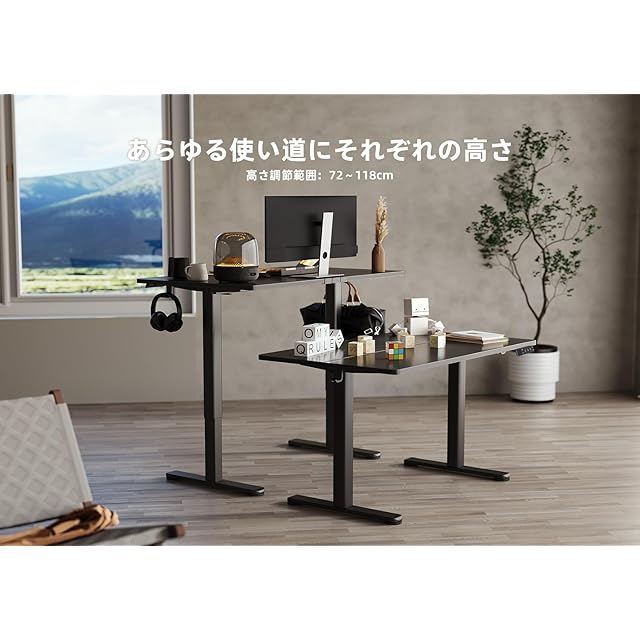 【高さ調節可能】昇降範囲:72〜118cm、昇降速度:20mm/s。ゲーミングデスク、オフィスデスク、勉強机など、使い方に合わせて高さを自由に調整することができます。また、よく使う高さを3つまで記憶することができますので、お気に入りの高さにワンタッチで戻ることができます。