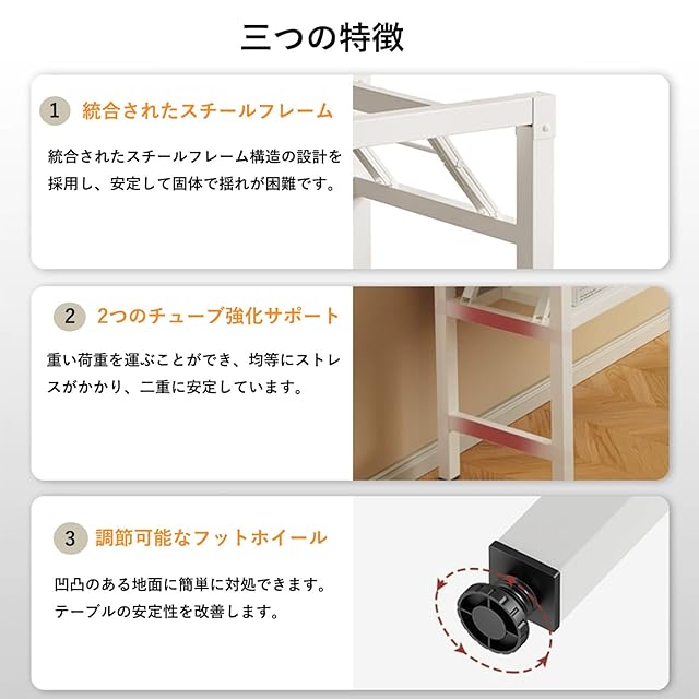 【天板材質】:高品質木板を採用します、耐荷重が優れます。改良技術により天板が均一に塗布されます、すり傷がしにくい、軽度防水ができます。切創・衝突防止ため、四角にR角に仕上げられています。