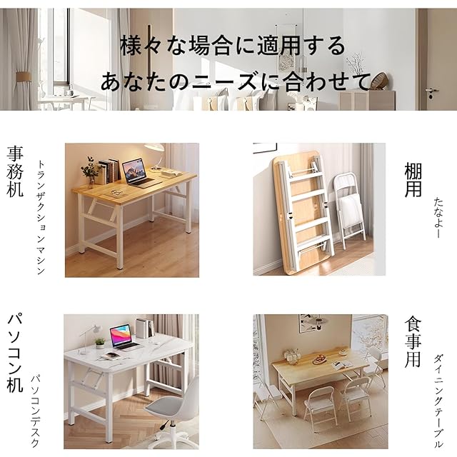 【インテリアに馴染むデザイン】:シンプルで洗練されたデザインの折り畳みデスク。家具の隙間にスリムに収納可能できるから使わない時も場所をとりません。PCデスク・勉強机・ゲーミングデスク・ミシン台・作業机・サイドテーブルなど多目的用途で使用できます。