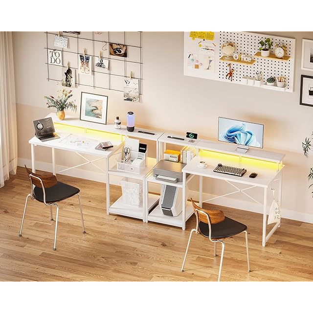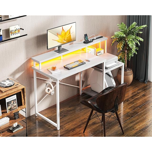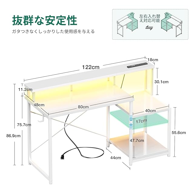 AODK デスク パソコンデスク ゲーミングデスク ラック&コンセント付き 机 pcデスク 幅120cm モニター台&プリンター台付き 勉強机 桌子 LEDライト付き ゲーム/在宅ワーク/オフィス用 左右入れ替え対応 ホワイト