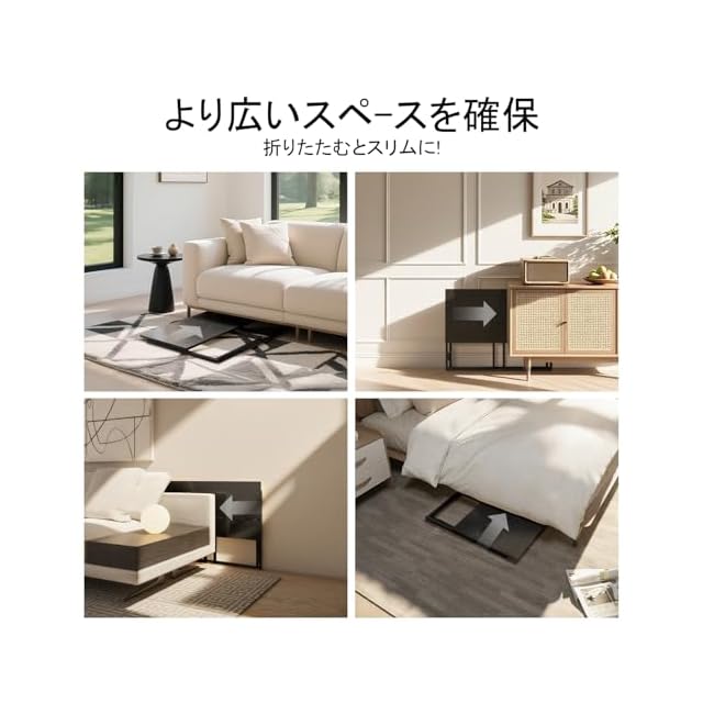 【超薄6cmコンパクトで収納楽々】折り畳時はわずか幅80×高さ76.2×厚さ6cmの薄型サイズ!使わない時はドアの後ろ、ベッド下、ソファ横、冷蔵庫の隙間などのちょとしたスペースに収納可能。省スペースで収納場所を選ばないポータブルテーブルです。
