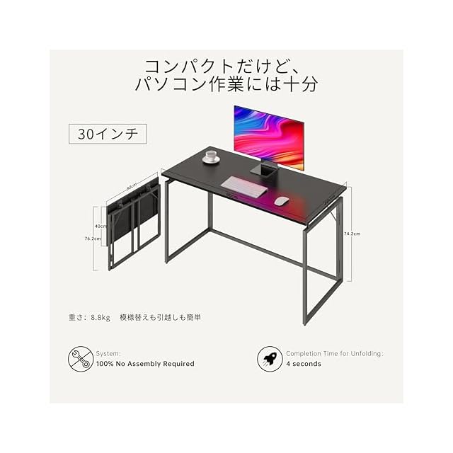 alawooder 折りたたみテーブル【 正規品】 机 折り畳み デスク 完成品【組み立て不要】省スペース僅か6cmの薄さ 耐荷重60kg パソコンデスク コンパクト オフィスワークテーブル 在宅ワーク デスク ゲーミングデスク 在宅勤務 (ブラック, 30インチ)