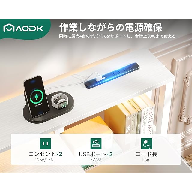 【コンセント付き、作業しながらの電源確保】机にはコンセント2口+USBポート2口が付いている。同時に最大4台のデバイスをサポートし、合計1500Wまで使える。手近なところで電源が取れ、スマホやタブレットなどの充電が便利になり、電池残量を気にせずに長時間の作業が可能。