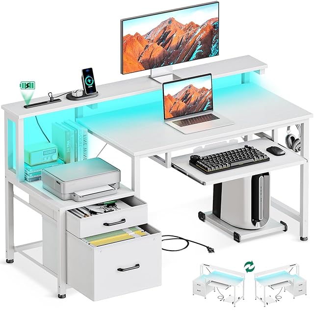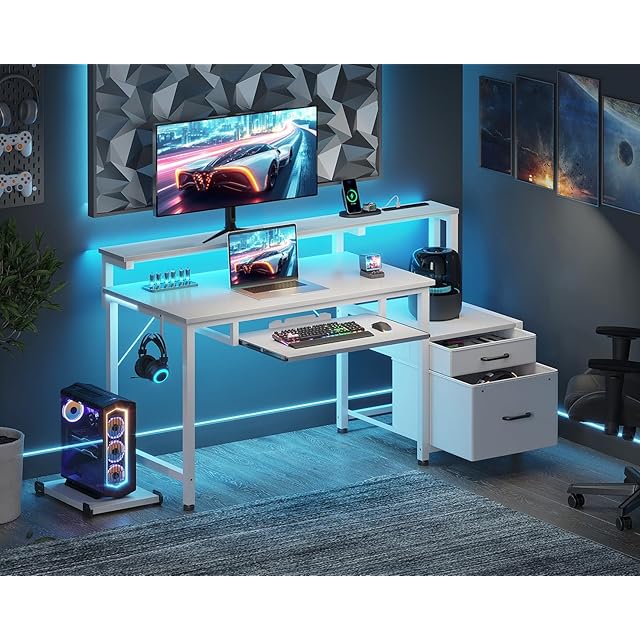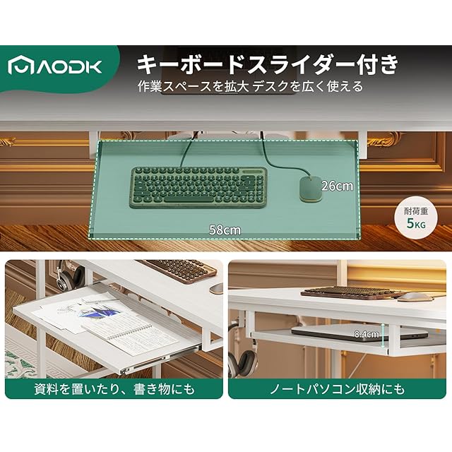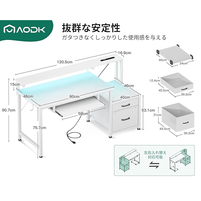 AODK パソコンデスク ゲーミングデスク 引き出し&キーボードスライダー付き 幅120cm 机 pcデスク computer desk 桌子 コンセント&LED付き ゲームデスク 長机 CPUスタンド付き 在宅ワーク 左右入れ替え対応 ホワイト