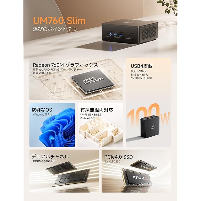 【優れたパフォーマンス】MINISFORUM UM760 SlimミニPCは、CPUにRyzen 7 6800Hよりパフォーマンスが上位のAMD Ryzen 5 7640HSを搭載し、プロセスルールが4nm、Zen4アーキテクチャに基づいており、6コア/12スレッド、最大コア周波数は5.0Ghzに達します。GPUに革新的なAMD RDNA3 アーキテクチャーを搭載したAMD Radeon 760M を採用し、最大2600MHzに達します。一般家庭/日常オフィス/軽くゲーミングのために設計されています。