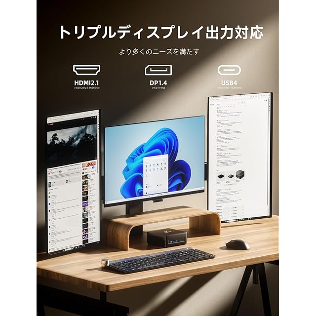 【トリプルディスプレイ出力】ディスプレイ出力端子にHDMI 2.1(4K@120hz/8K@60Hz)x1、DP1.4(4K@144hz)x1、USB4(4K@120hz/8K@60Hz)X1を搭載しており、同時に3台のディスプレイへ独立出力できます。より大きく広い視野を提供し、仕事の効率を向上させ、オフイスでの作業、エンタ-テイメントメデイアの再生、ゲーミングを同時に使用して様々なニーズを満たす。【USB4】USB4ポート搭載。最大は40Gbpsに達します。15W PD給電対応、ケーブル一本で、映像と電源を送る事が出来できます。