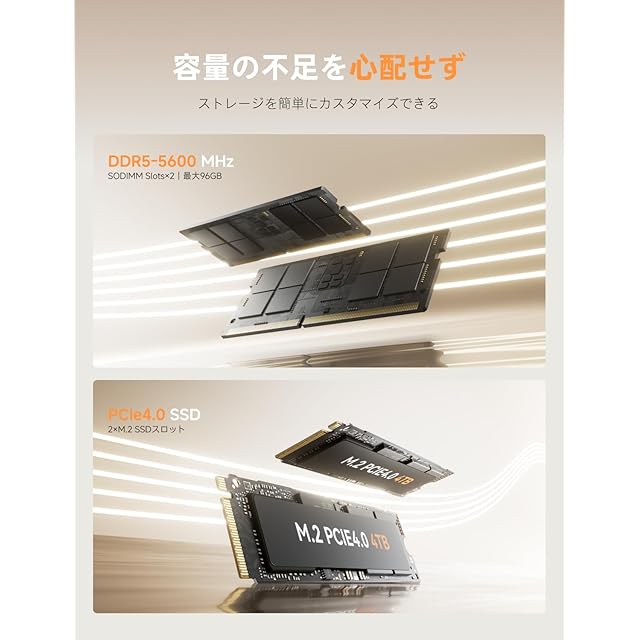 【大容量】DDR5-5600 32GB(最大48GBx2)メモリ+M.2 2280 1TB PCIe 4.0 SSD (最大4TB)ストレージ 容量の不足を心配せず、ストレージを簡単にカスタマイズできる。メモリがDDR5に対応して帯域幅が大幅に拡張される。超高速PCIe4.0 SSDを搭載しているため、OSをより高速に実行できます。データ/映画/デジカメ写真の保存など、ストレスなく気軽に対応します。
