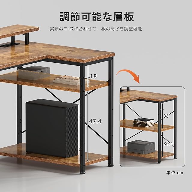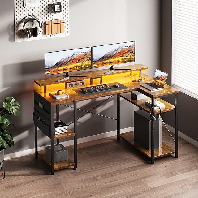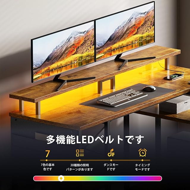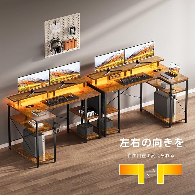 YeTom l字デスク pcデスク幅130cm LEDライト付き パソコンデスク 机pcデスク コーナーデスク 棚板高さ調節可能 収納袋付き L字型 PC 勉強机 左右入れ替え対応 ゲーム 書斎ビンテージ