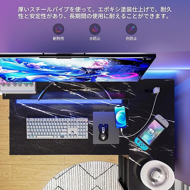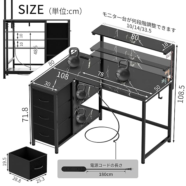 LunarLight PCパソコンデスク 幅108奥行80高さ85-108.5cm テレワーク L型デスク・左右組み換え自由 モニタ台の高さ調節可能 引き出しとコンセント付き 収納たっぷり ゲーミングデスク オフィスデスク 書斎 収納ラック付き (大理石調ブラックMBK, L型)