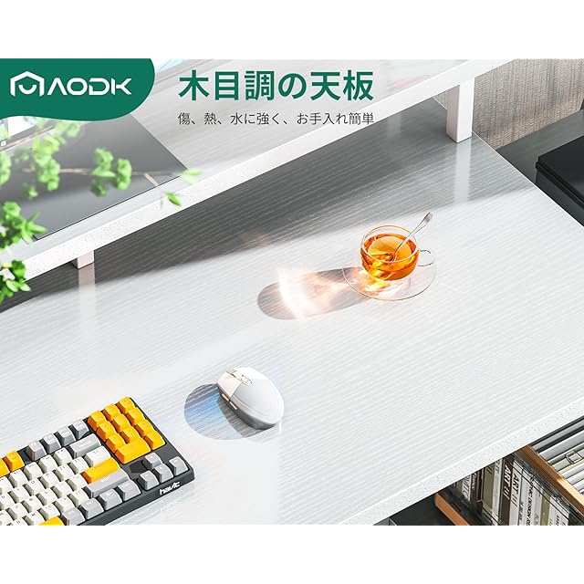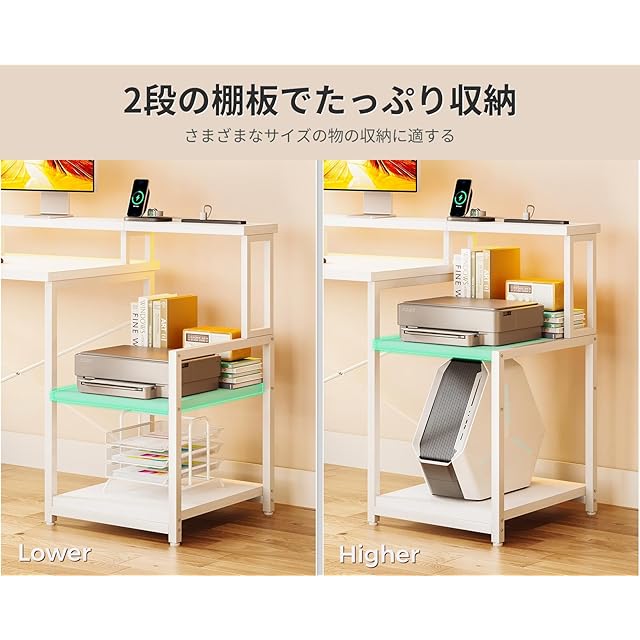 【革新的な収納設計、たっぷり入る収納力】収納ラック+超長い机上台+フックが備わっており、多サイズの物の収納に適する。ラックの部分は左右どちらにも設置OK。棚板が2段あり、置くものに合わせて上段の棚板の位置が調節可能。上段はプリンター台として、下段はCPUスタンドとして使用することをお勧めいたします。デスク周りをちゃんと整頓いただけ、お部屋がスッキリ。