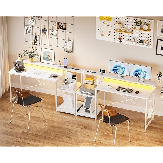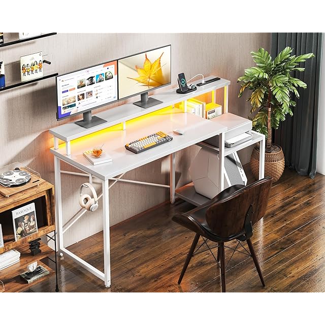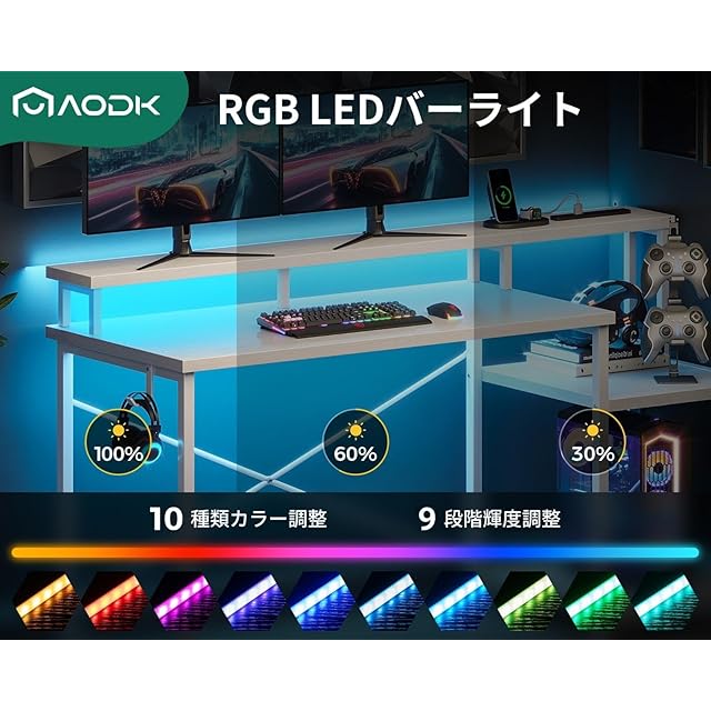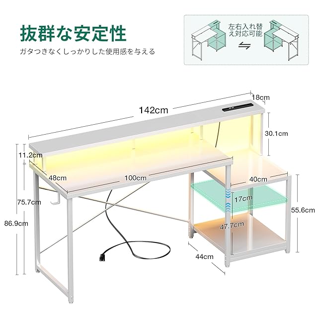 AODK デスク パソコンデスク ゲーミングデスク ラック&コンセント付き 机 pcデスク 幅140cm モニター台&プリンター台付き 勉強机 桌子 LEDライト付き ゲーム/在宅ワーク/オフィス用 左右入れ替え対応 ホワイト