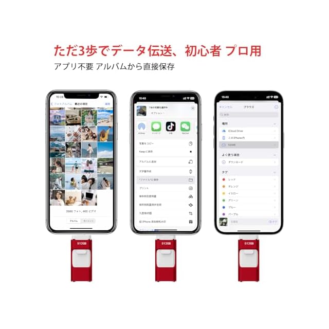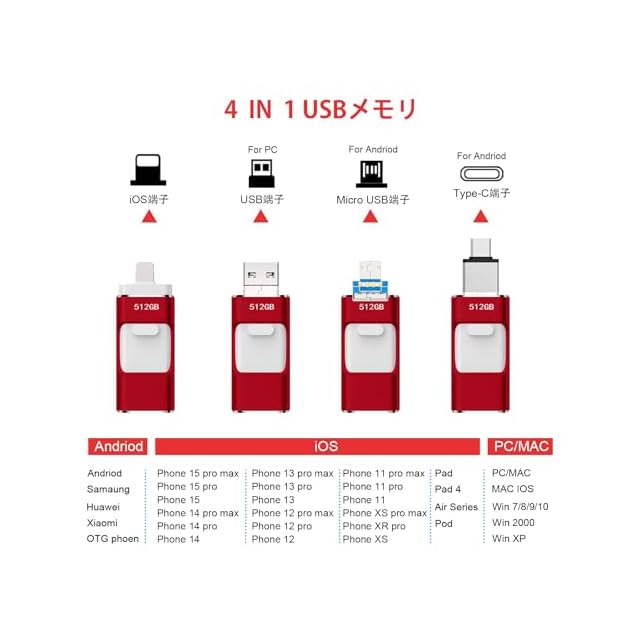 【多機種対応】 USBメモリ にはiOS、USB、type-c、micro USBの機種の接続タイプが4種も使用出来るので、PC/Android/MacBook/iOSで簡単にデータ バックアップです。 usbメモリはPhone 15 Pro Max/15 Pro/15 Plus/15/14 Pro Max/14 Pro/14 Plus/14/SE 3/13 Pro Max/13 Pro /13/13 mini /12 Pro Max/12 Pro/12 /SE 2 /11 Pro Max/11 Pro/11 /XR/XS Max/XS /X /8 Plus/8/i Pad Air(第1/2/3世代)/ MacBook(Pro/Air)/iPad mini(第1/2/3/4/5世代)/i Pad(第5/6/7/8/9世代)全シリーズ/ パソコン/ Type-Cスマホ/ Androidスマホ /タブレットなどとデータ移行 互換性のあるusbメモリ。